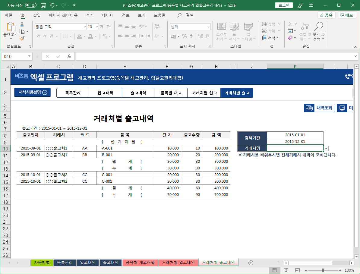 Jun 15, 2019 · 지점별 매출관리프로그램 / 매출관리양식 / 보고서 양식 2019.07.24 엑셀 자동화 무료나눔 자동으로 계산되는 급여명세서 양식 2019.06.02 엑셀 자동화자료 자동화 법인카드관리대장으로 손쉽게 비용관리하는 요령 2019.05.26 Aug 04, 2021 · 엑셀프로그램서식 및 매입매출 통합관리, 입출금 등 통합관리 프로그램 엑셀자료다운 완제품별로, 원자재별 입출고 내역을 작성하고 관리할 수 있는 프로그램을 아시나요? 이번 포스팅에서는 엑셀 자재관리 양식을 소개해드립니다. 엑셀 일정관리 월간일정표 양식 다운로드 (월간 프로젝트 계획표) (0) 2019.08.16: